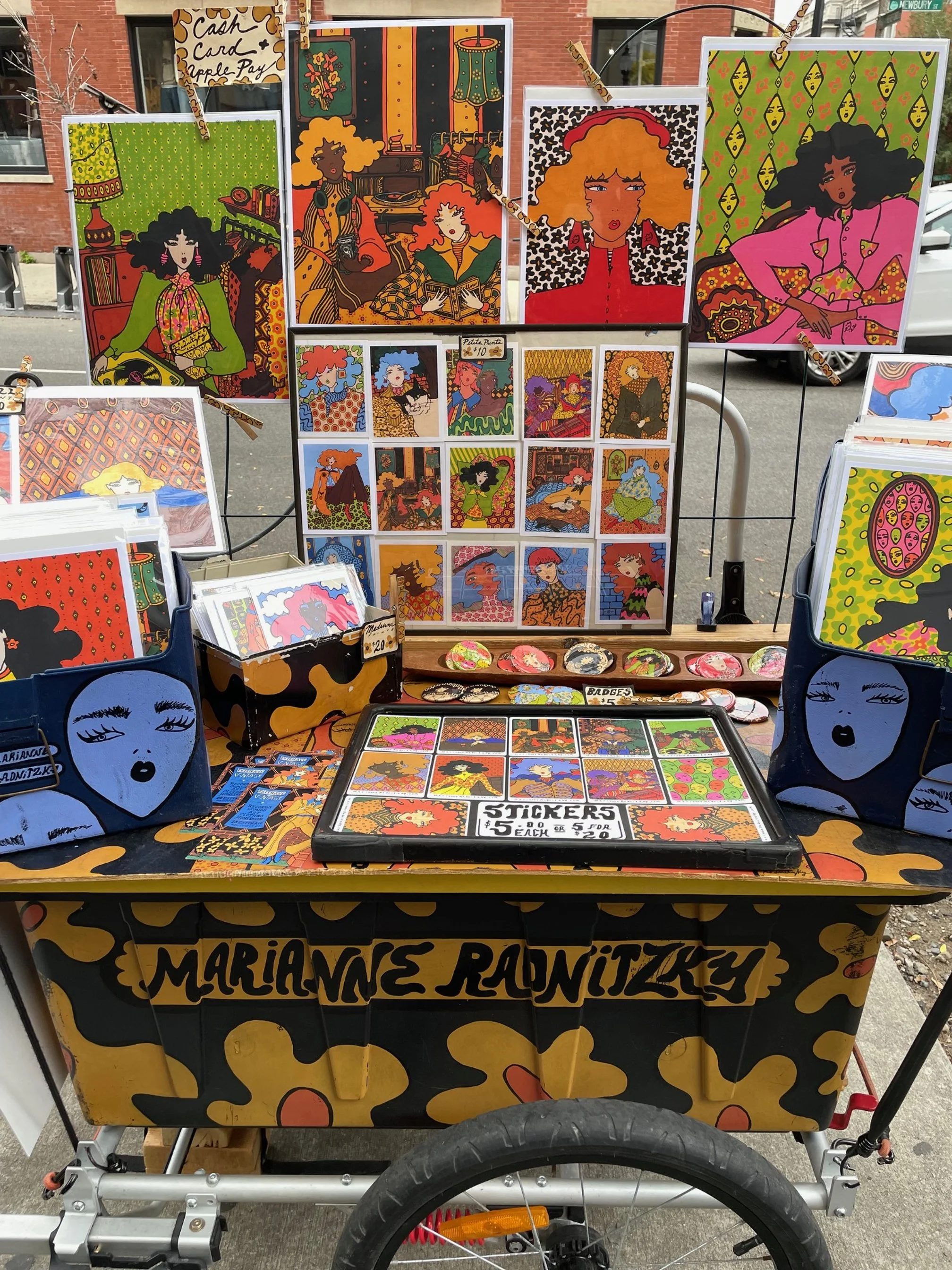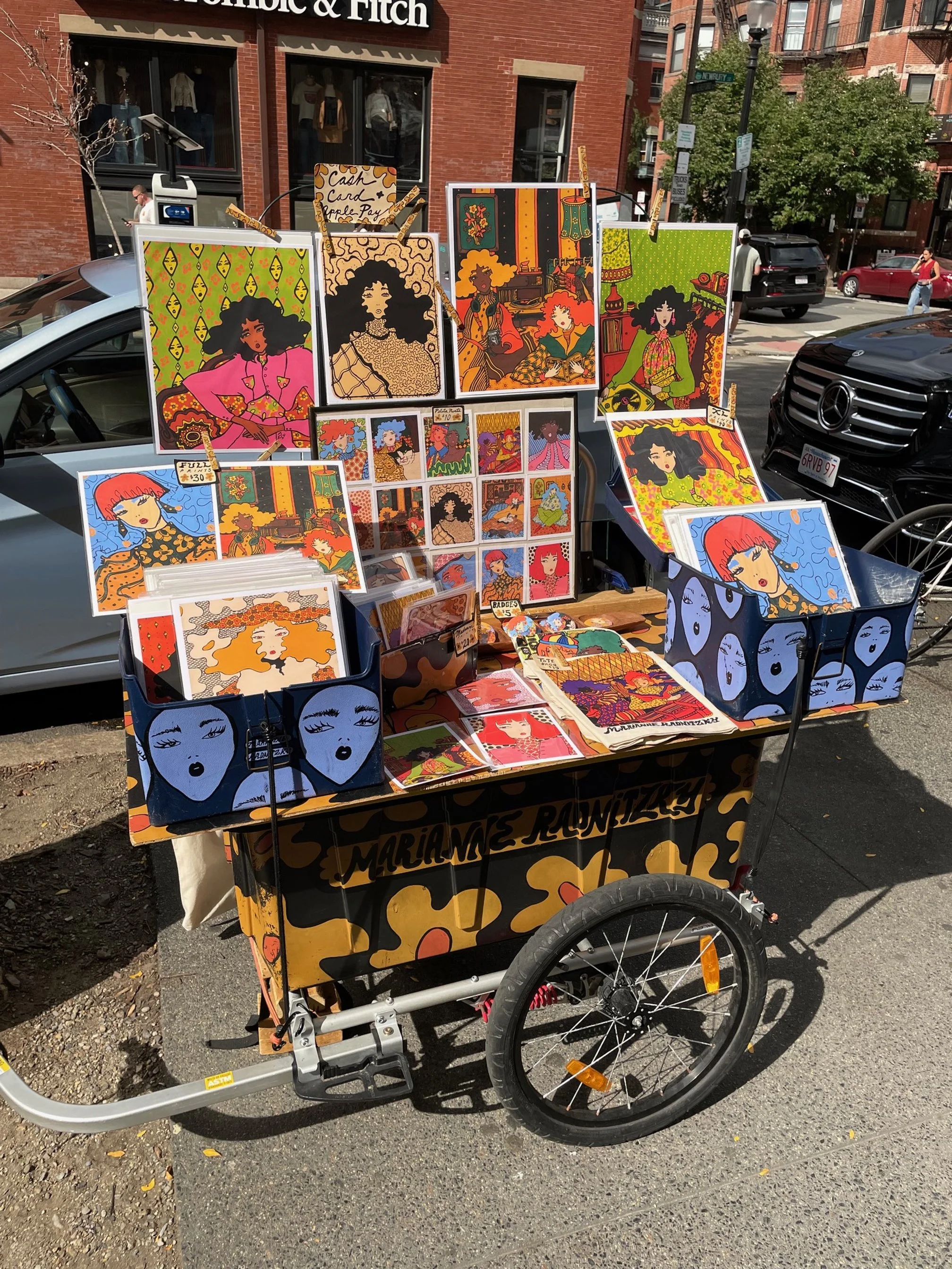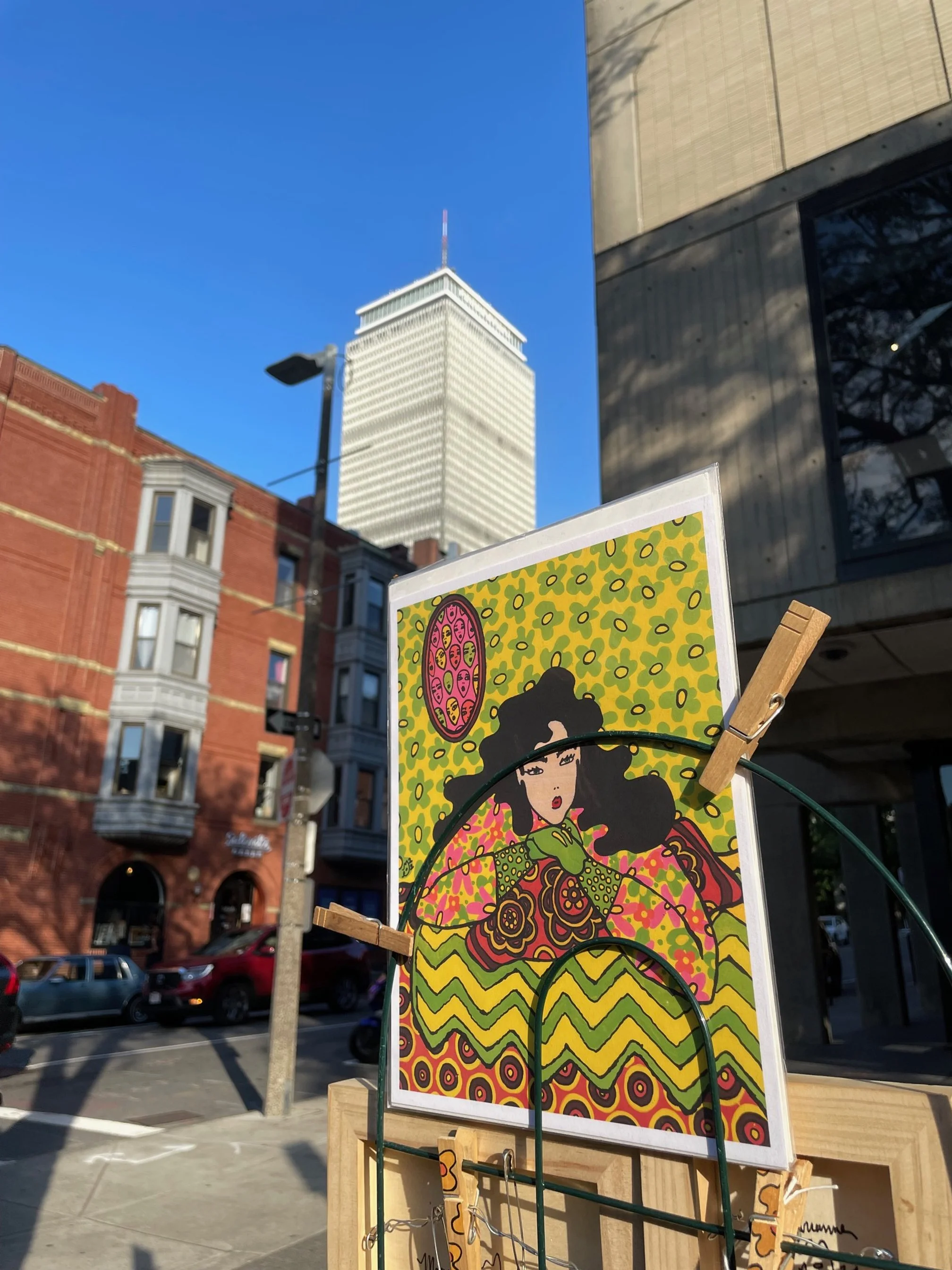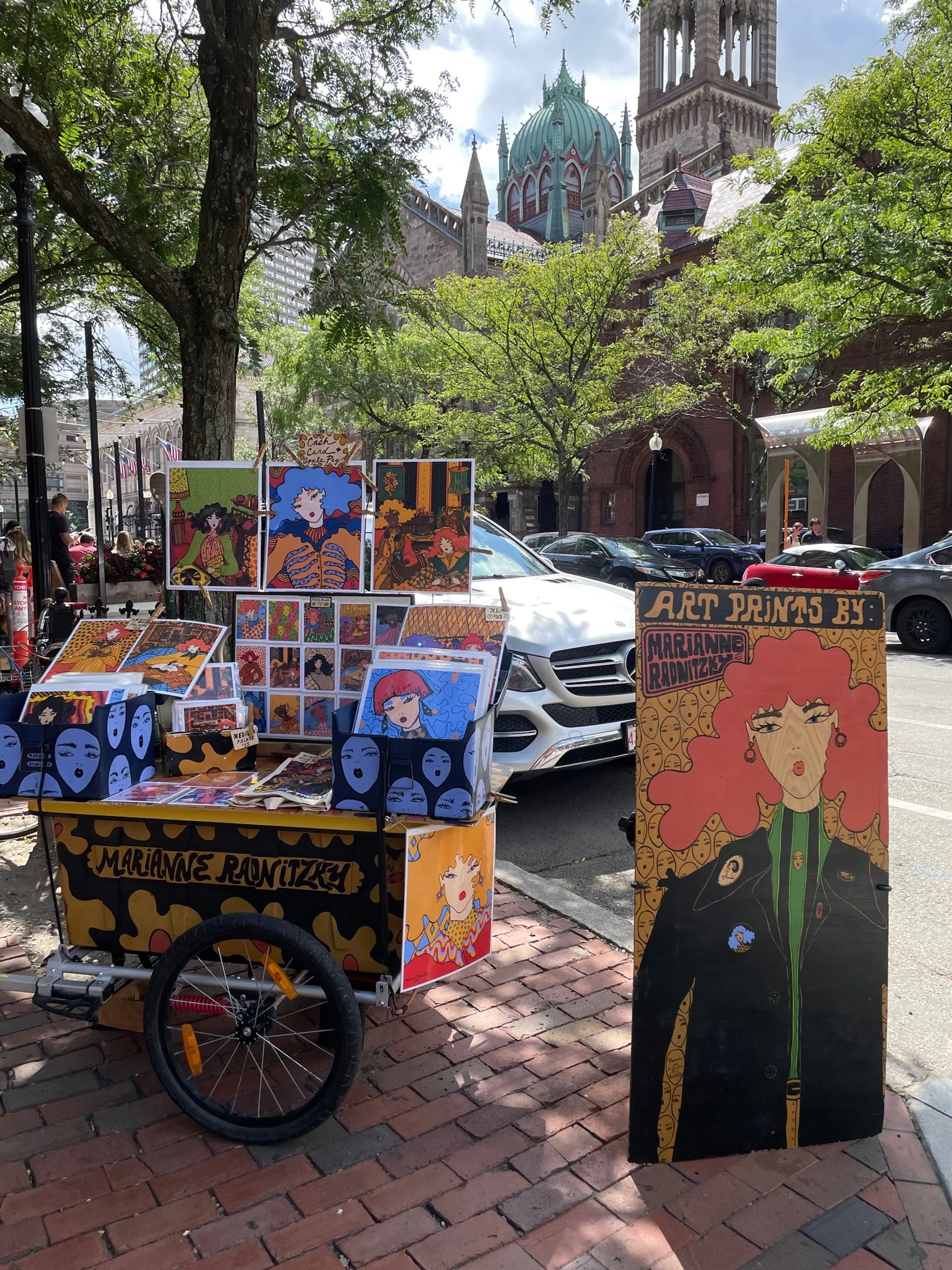 Find me in the streets of Boston on the weekends when it’s nice and I don’t have art markets going on. I ride my art into town with my custom bike trailer and set up for a few hours each weekend!